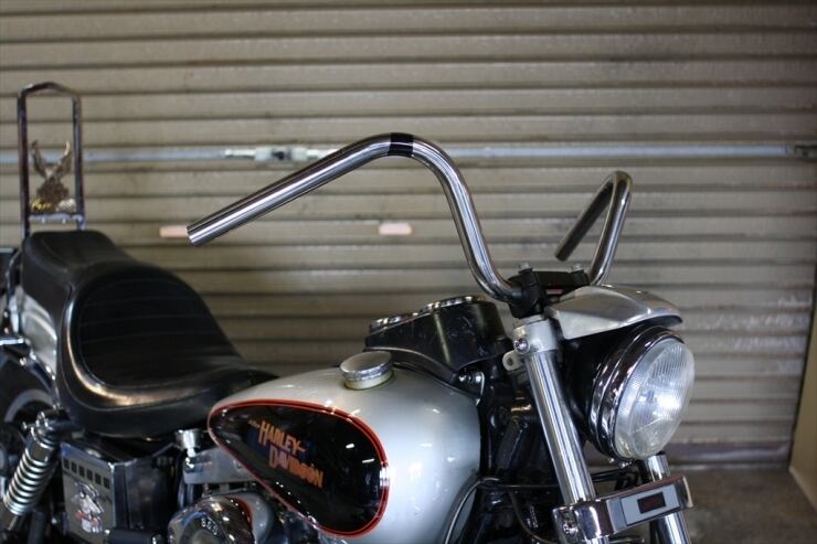 ショベルFXSローライダー純正プルバックハンドル(56083-74)と同形状で、82年以降用のディンプル(配線の逃げ)有りです。